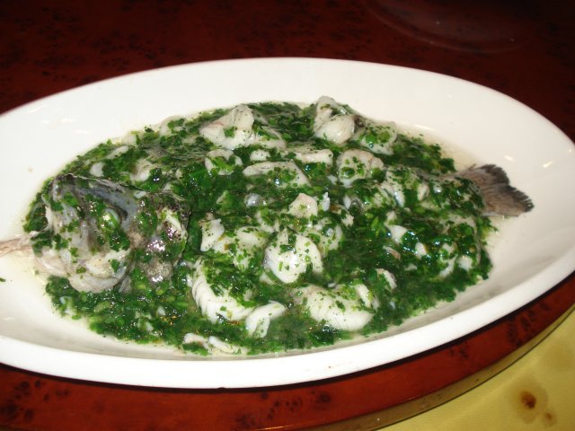 荠菜鲈鱼片,摆盘还是鱼的形状哦,鱼片好嫩,没有什么骨头,荠菜也蛮鲜的,两者搭配得很好哦。