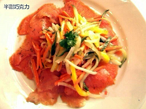 切成薄片的三文鱼烟熏过,蘸上秘制的酱汁,再裹上些香草碎,