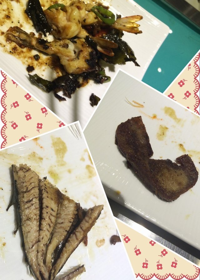 #龙井基围虾# 这个也超赞!是炸过的龙井茶叶配基围虾在铁板炒,虾好像打了个结一样,很有趣。厨师长说茶叶也可以吃,而且这道菜不长肉,还减肥。虾虽不大,但是很鲜嫩,有股茶叶的清香,给我们做的是微辣口,很喜欢~吃了片茶叶,很脆,有茶香也有虾肉的香味。