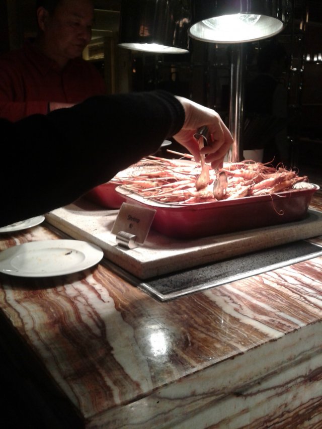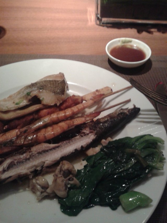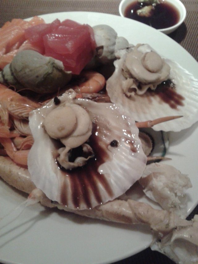 上来先吃点生冷的咯,拿了些雪蟹腿啊,海螺,扇贝王,白灼虾。那个蟹腿很细小,而且吃上去有点腥,不太新鲜,很一般的说。海螺,味道不错,螺肉弹弹 的。扇贝王,个头还挺大。白灼虾,比较实在,我倒了点黑醋汁,蘸着吃,味道还蛮好的。