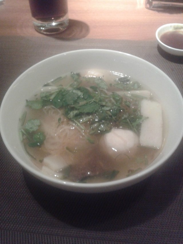 我还去下了碗面,挑了些料,像包心鱼丸啊,牛肉片啊,鱼豆腐什么的,面条也蛮筋斗,吃吃还不错的说。