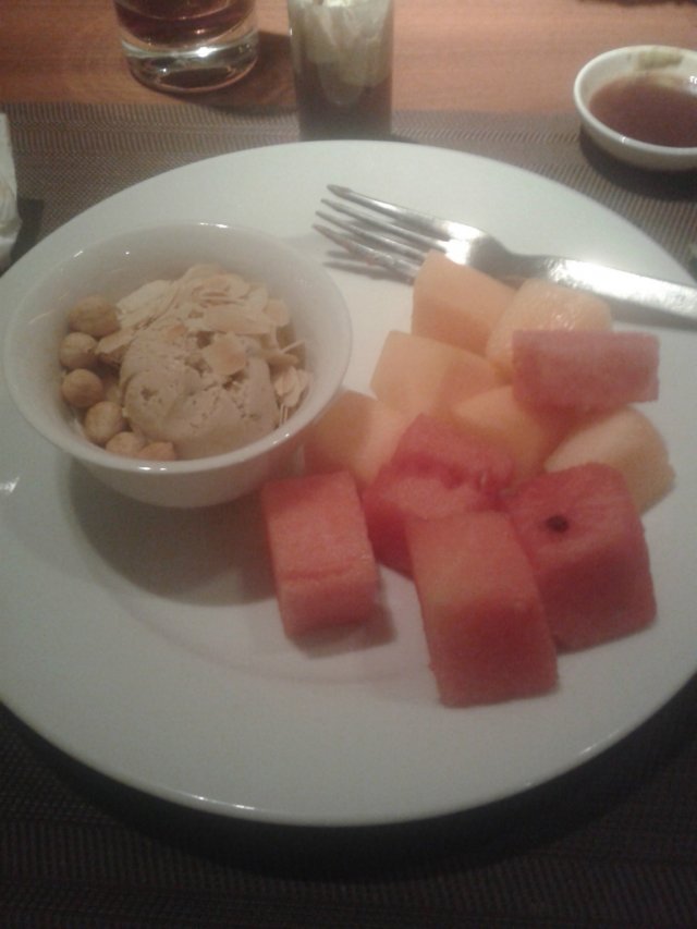 冷的热的都吃完,开始上甜品,水果,冰淇淋了。