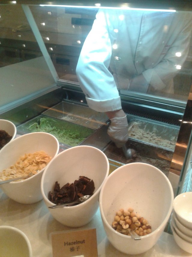 冰淇淋,我选了朗姆口味,抹茶的还有巧克力的,可以自助加各类坚果,奥利奥啊,玉米片什么的配料,我吃的那三种口味里,我最喜欢巧克力味的。