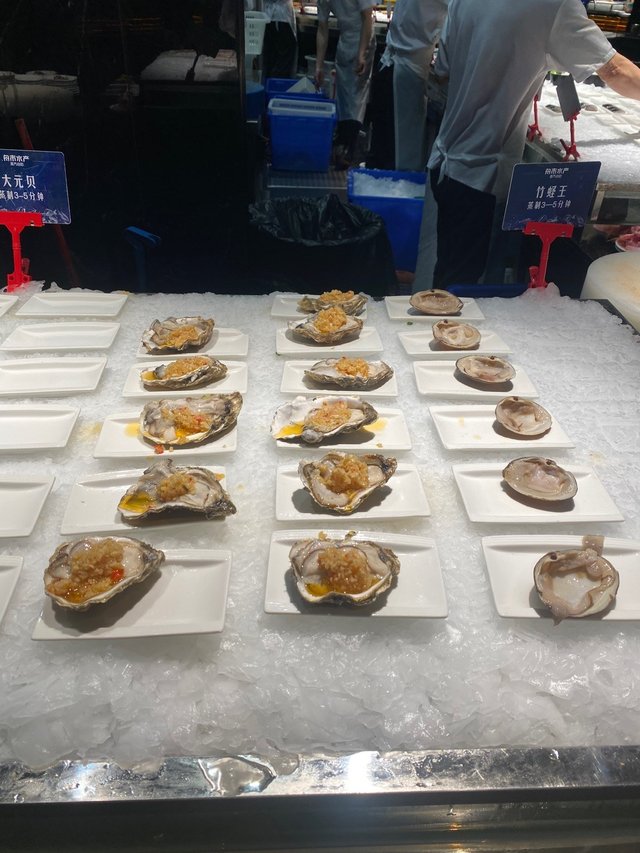 入到店,環境走簡潔路線,冇華麗裝修但夠晒整潔,海鮮區同熱食區劃分得好清晰,唔使周圍搵嘢食,呢點幾加分。坐低之後第一時間衝去海鮮區,果然冇失望——貝類真係超級新鮮,蒜蓉粉絲蒸带子同扇貝,個頭夠大,肉質嫩滑,蒜香同海鮮嘅鮮甜融合得岩岩好,咬落去每一口都係幸福感。而家啱好係大閘蟹旺季,店入面嘅大閘蟹膏多到「漏」,拆開隻蟹,滿滿嘅蟹膏入口濃香,連平時唔多鐘意食蟹嘅太太都食咗兩隻。最值得一提嘅係補貨速度,海鮮一見底,工作人員就好快補上,仲有專人幫忙清洗,完全唔使自己費力,服務好到位。