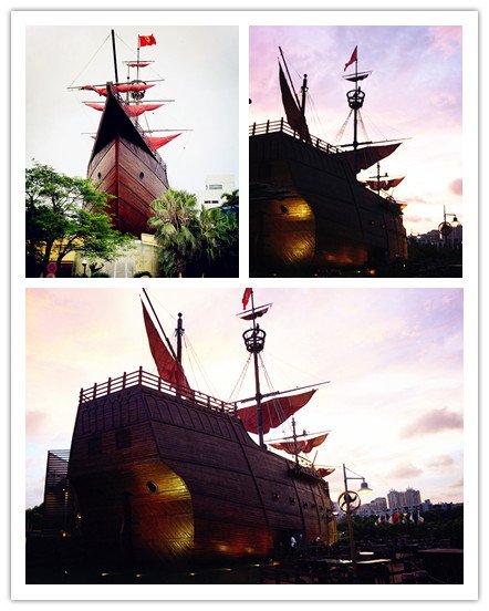 西班牙的航海史在15-17世纪可谓登峰造极,世界首屈一指的意大利航海家哥伦布就是西班牙王室出资才得以航行发现地球是圆的。在以西班牙为主题、处处体现西班牙细节的华侨城洲际酒店,拥有一艘霸气的帆船是理所应当的,当你驱车从深南大道华侨城段经过,无一例外会看到那高耸伫立的大帆船。进去里面也极曲折,一定要先搭直升三楼的电梯,经过水边木头铺就的栈道,从室外将会坐满俊男美女的座椅中穿过,才能进入厚重的船体内部。