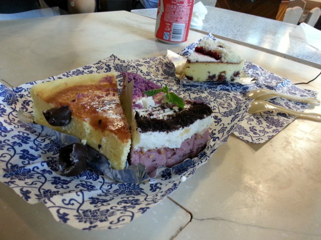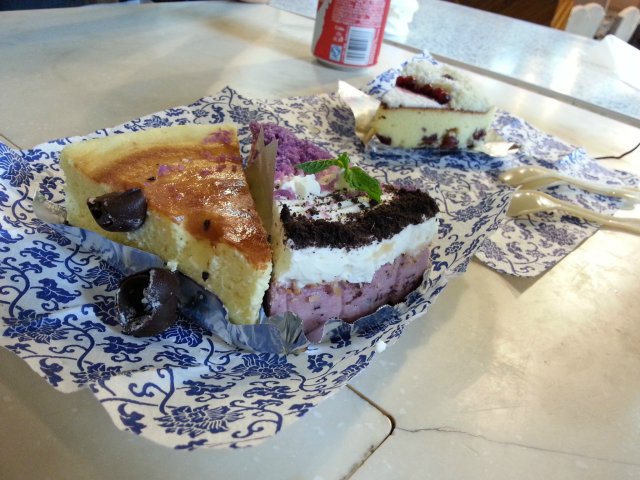 选了三款蛋糕,最知名的榴莲芝士,还有蓝莓芝士,和另一个名字忘记的蛋糕。