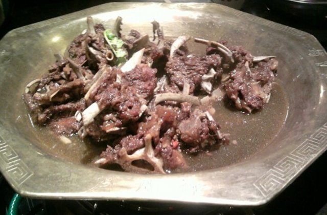 羊蝎子中锅5斤(58元)其中小锅48元4斤,大锅68元6斤,服务员推荐我们6斤的,可是我们只有4个人,不靠谱,于是要了中锅,其实量挺大的,肉还挺多的,一人四五块没问题的,味道还可以,不太辣,我还能吃,肉质呢,有点喳喳的感觉,他们说是调料的缘故,对于这个,我没太多喜好,所以吃不出啥感觉来。