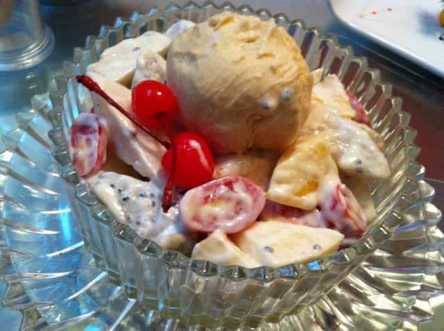 鲜果沙拉冰淇淋:这个我们大家都爱,最后又加了一份,水果沙拉就很好吃,如果上面加了个冰激凌球呢,虽然只是小小的改动,但是让菜的感觉就完全不同了。