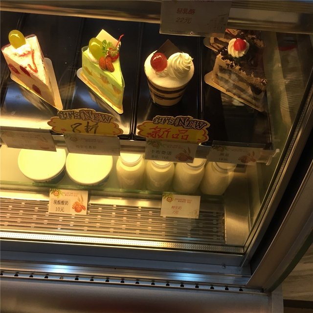 冰柜里有各种切角的蛋糕,慕斯的,提拉米苏的,哈密瓜蛋糕(目前是新品,再打八折)