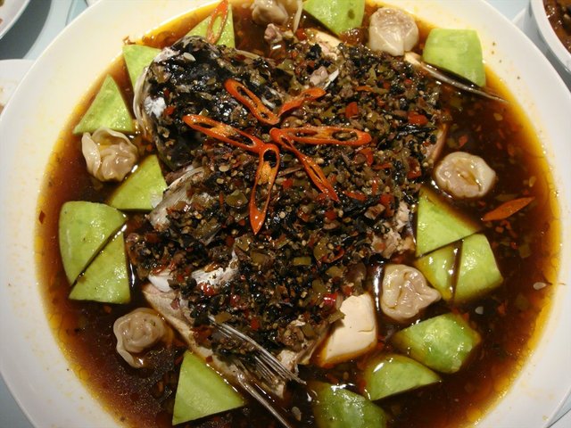 糊辣子蘸水芽豆: 看里面红白绿的各色小配料,原本怕会很辣,搅拌来吃味道刚好,云南特色,四周的绿色瓜不是黄瓜哦,是云南当地的一种小瓜,鱼头下面垫了豆腐,鱼跟豆腐相配当然会美味,何况上面搭配了干巴菌等云南特色的干菜