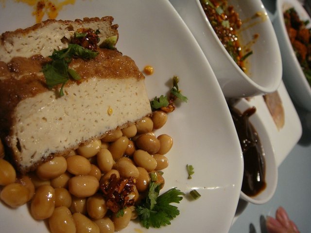 清蒸牛肉配卤水老豆腐:老豆腐没拍好,大家看牛肉就好了,豆腐蛮好吃的,下面垫底的是黄豆,牛肉沾着酱汁味道也很赞