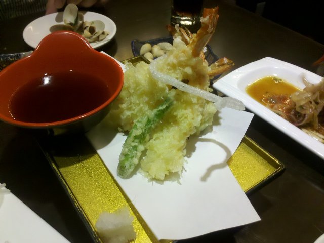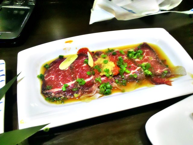 他们家的食材都还比较新鲜,但是唯一让我比较失望的是他们家的甜虾,个头好大一个跟初花有点不一样而且还带壳,但是还是吃了很多,肉质很Q但是甜味不够,倒是用这虾做天妇罗倒很美味,虾皮脆的可以吃掉,外面裹的天妇罗粉也刚刚好炸到金黄又不油腻很不错。他们家的生拌牛肉不错,肉质很新鲜嚼起来很带劲,拌的料也很入味,吃了好多。