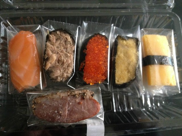 寿司是MM帮着配的,分了两个盒子装的,饮料还是原来的乐天桃汁,酱油和芥末配了好几包,很贴心。