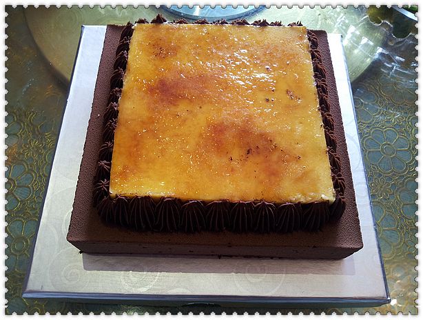 这是一款非常美味的蛋糕~ 巧克力蛋糕做底,蛋糕上是慕斯,用一圈巧克力花边围了起来,然后最上面是薄薄的焦糖~