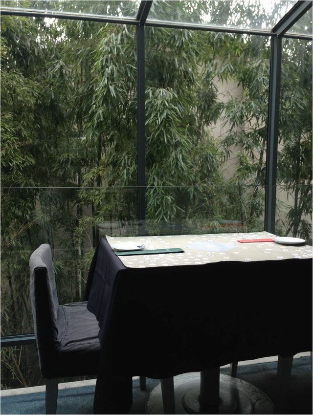 拿了个号牌上3楼,一看装修就是LOFT风,楼梯是昏暗的灯光,上楼稍微开阔些,坐在里临落地窗边的2人位,边上就是郁郁葱葱的竹子,楼下还有多人沙发,一应的白色。