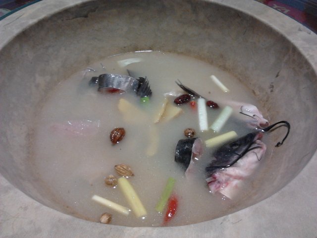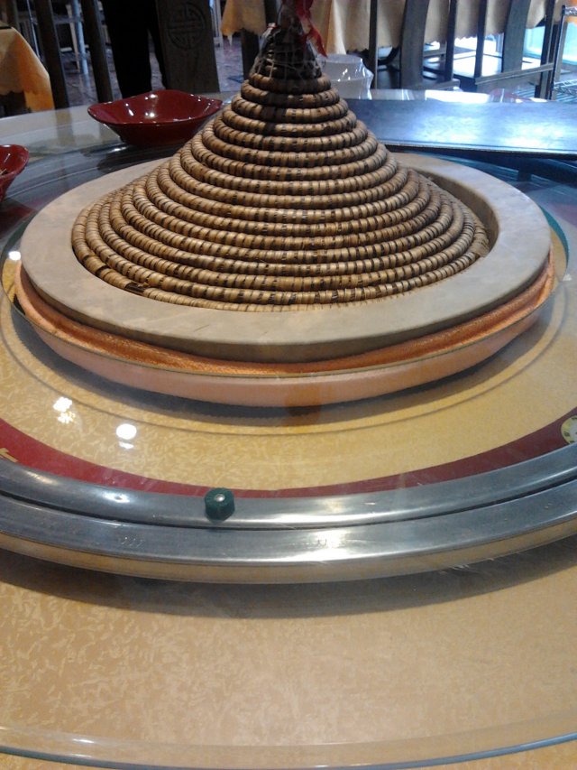 店的门口是很大的鱼缸,里面养着鲜活的大鱼,要吃的鱼都是从这里捞出来的,很新鲜。店里的空间不是很大,大概是6.7张桌子吧,室内的空气不是很好,有些潮湿,有点闷的感觉。最有特色的是每个桌子上都有个大草帽,草帽下就是大大的石锅。石锅很厚重,颜色是浅色的,看着很有意思,而且石锅的加热是靠蒸汽的,不是普通的煤气,这个也很有特色。