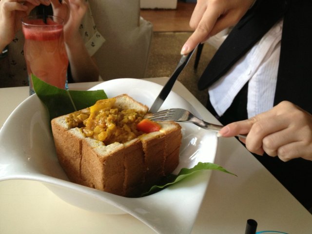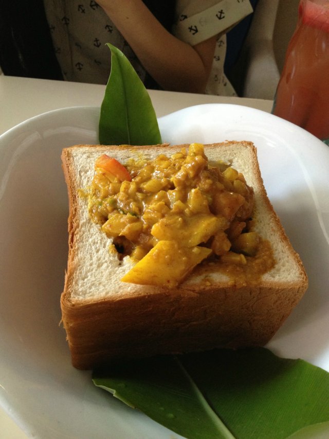 这道菜和小杨楼的金包咖喱鸡是一样的,就是挖空一个方形吐司,然后把咖喱鸡放进去。