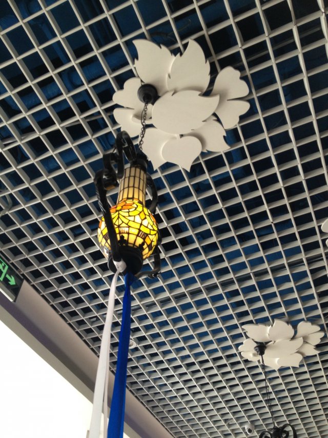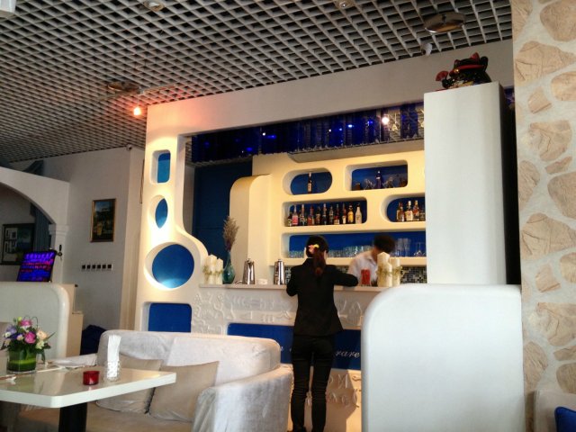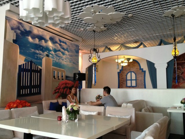 无论是漂亮的吊顶,大大的落地窗,蓝白色的装饰风格,蓝天白云城堡的装修,都让人觉得这里算是个市区内的另类桃源,在这个炎热的夏天确实给人一种很清凉的感觉。