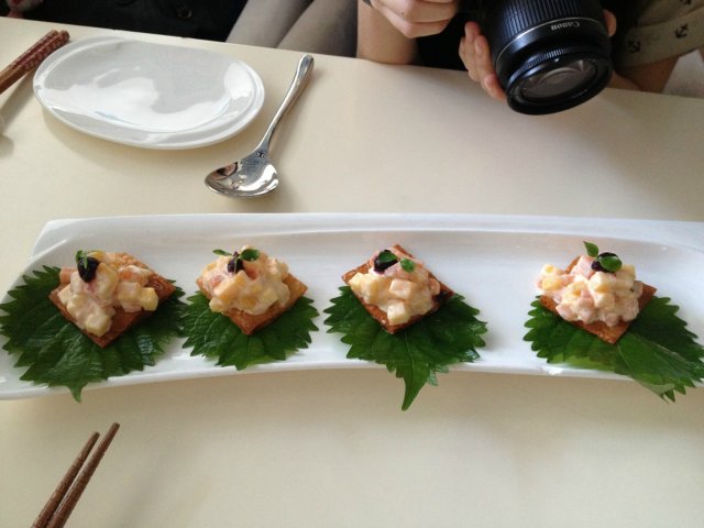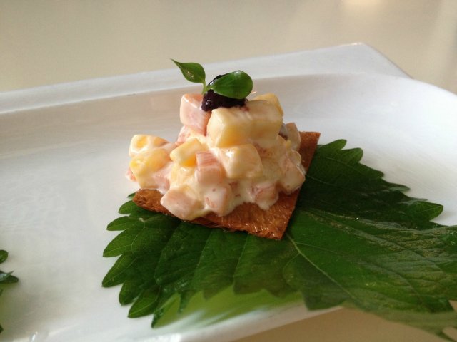 所谓千层酥应该是豆皮腐竹一类的东西炸过之后变成酥皮,上面铺着沙拉拌过的三文鱼和芒果丁,相比而言可能芒果丁更多一些,基本没有明显的三文鱼口感,顶端还有一颗可爱的蓝莓。