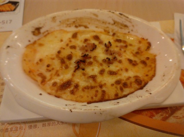 薯蓉是被现烤过的,盘子的边缘还有些焦焦的痕迹。起初闻起来,并没有太过浓郁的芝士香味,用勺子扒开表皮之后,一股香味就窜了出来。