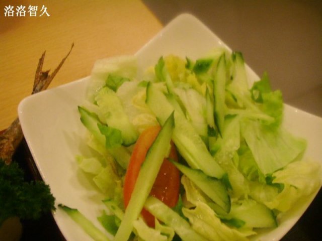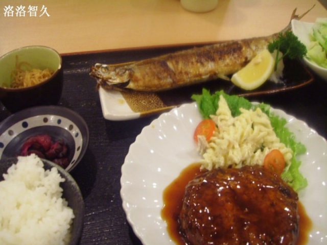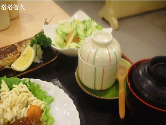有蔬菜色拉,味噌汤,蒸蛋(可供食客选择,蒸蛋OR煎蛋,可选一款),酱菜,还有粉丝~一条烤秋刀鱼,一个和风酱汁汉堡,边上配着一些pasta~一碗米饭~