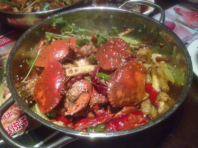 @爆椒干锅香辣蟹,这个干锅有点特别,因为他有点奶油的味道,虽然我没有前面两个那么喜欢,但是我姐姐们觉得倒不错。里面的蟹肉不多,感觉都是些蟹钳啦,蟹腿啦,蟹壳啦。配菜有笋什么的。