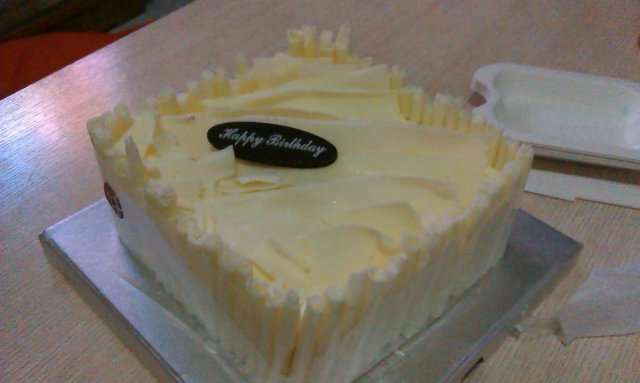 晚餐我们去外面吃的,懒得拿蛋糕去餐厅了,吃完饭回家吃的蛋糕,从冰箱拿蛋糕的时候我才发现里面没有蜡烛啊,还有里面竟然有3根小烟花。。 难道是让我把小烟花插到蛋糕上??不过别说他们家的慕斯蛋糕挺纯的,榴莲味挺浓郁的,超级好吃啊。白巧克力也挺多的。总之他们家的蛋糕挺好吃的。超赞, 非常推荐他们家的蛋糕。还有随蛋糕还送了我一小袋咖啡,真不错。。