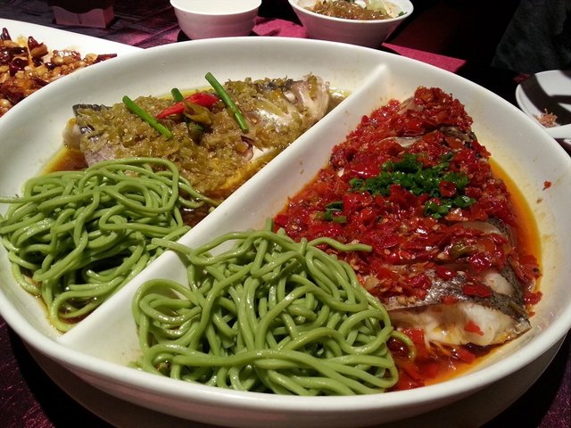 双椒鱼头也是非常喜欢的菜品,盘子有隔断,两种颜色的鱼头不会串味,吃着各有各的特色。比较喜欢青剁椒的鱼头,酸辣入味,鱼肉鲜美,混合着剁椒一起吃辣的很爽口。红剁椒的皮感觉有些厚,口感差了些,鱼肉相对的也要更辣一下。面给的挺多的,拌着鱼汤吃味道很不错。