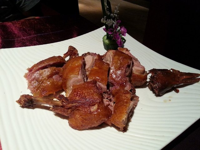 鸭子肉质紧致,吃着很有嚼劲,而且鸭皮吃着口感微脆,咸香适口。相对来说还是比较喜欢吃鸭皮,味道浓郁入味,没有什么油脂,吃着挺香的。鸭肉不是很入味,吃着比较清淡,不过味道挺清香的,蘸着椒盐吃味道很赞。