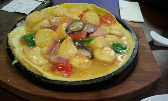 『三鲜豆腐』用日本豆腐做的,微微炸了一下,最特别的是厨师居然用蛋皮把铁板底包了一层,搭的这个菜颜色很漂亮,这个很有想法呢。