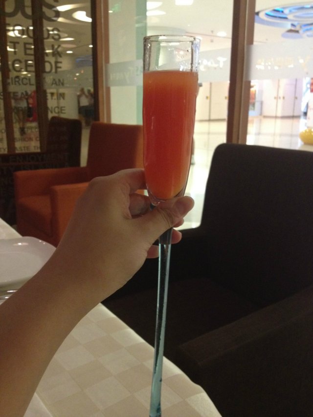 特别赠送的鸡尾酒,干冰飘着白气,是由白朗姆和君度调配的,淡淡的酒精味,还伴有果汁的香甜。个人觉得酒精多点儿比较好果汁可能就不会太甜了。