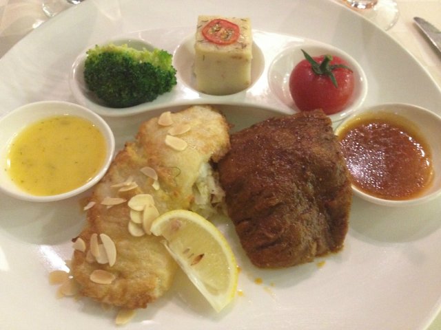 其实一直以来我对牛排的赶脚就是一般,但是吃他家的牛排第一刀切下去,觉得非常好切而且特别嫩,牛肉的纹理特别整齐。吃起来是真心的香啊完全不会有肉质硬或者塞牙的情况。龙利鱼是用蛋液煎的,特别的鲜美。蛋液的味道特别浓郁。下面目测是有白菜和碎培根。由于龙利鱼是煎制的,所以为了缓冲油腻,特别配置的酱料,感觉有柠檬的清香,微酸。和龙利鱼简直就是绝配。