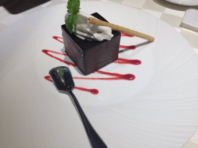 配上浓情巧克力甜点。基于前面分量十足的各种菜品,这块甜点个人感觉太大了,吃不了。巧克力上面铺着奶油,还有一根蓝莓口味的百奇。绵滑的口感,相当好吃。蓝莓的酸甜,奶油的细腻,外加巧克力的香甜完美的融合在一起。基于吃货不能浪费食物的原则,我全都给吃了。