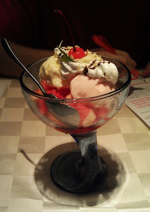 冰激凌水果圆舞曲:饭后甜品,最下层是水果:哈密瓜,西瓜,上面是二个冰激凌球,奶油,配上樱桃搭配