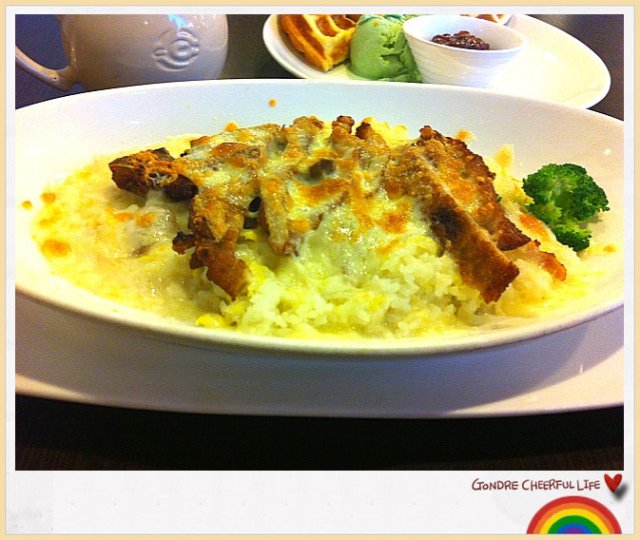 芝士洋葱汁猪扒焗意饭(配蓝莓布蕾),48元,猪扒比较硬,酱汁做得很好,有浓浓的芝士味道,米饭有些黏,口感一般。