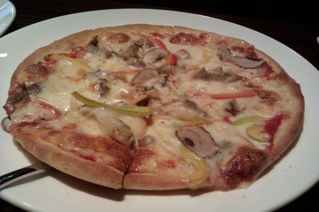 匹萨都是薄皮,有点意式做法的意思,芝士放的不好,不过食材的水份控制还有火候就有待商榷,有点偏湿,烤的不够香,芝士拉丝都困难……本想再点个菜,结果被告知想点的已经售罄,菜品采购供应上有时候跟不上有点小扫兴……口味总体来说清淡的有点过,服务尚可,据说在转型改进中,期待看到新气象了~~~