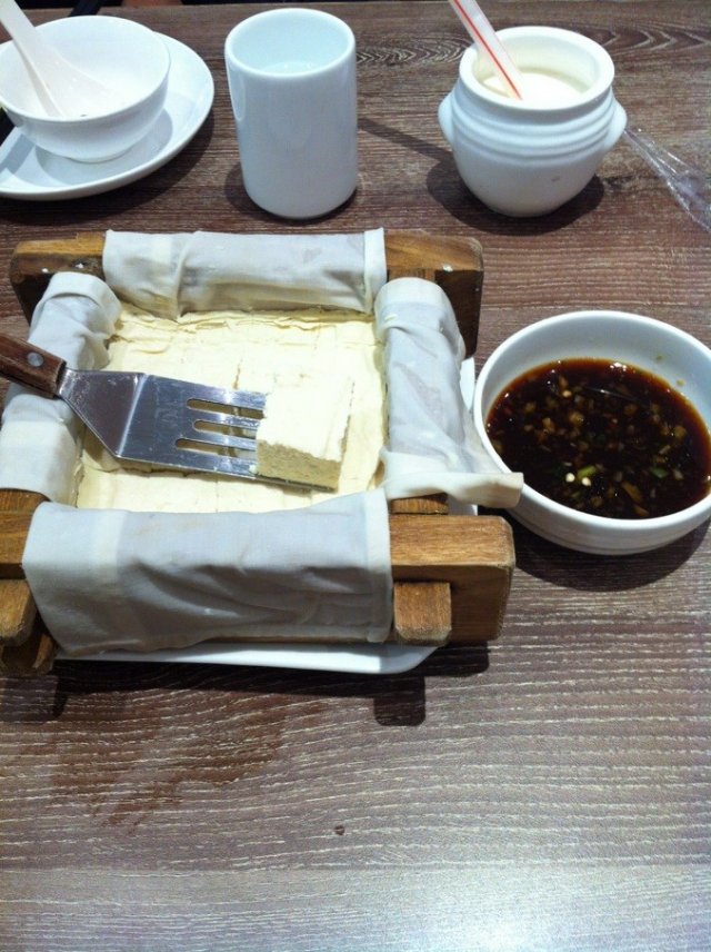 【石磨豆腐】:这是他们家的特色菜,现磨的豆腐,很新鲜,豆腐的质感很厚实,而且弹性非常的好,口感很有韧性,蘸着特有的酱料,味道被酸酸的,带着蒜香,葱香味一起进入嘴里咀