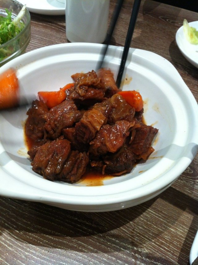【酱汁牛腩煲】这道菜的色面非常的诱人,油光光的,吸引着我们吃掉它,一块入口,酥烂的感觉,味道鲜甜,浓稠的酱汁包裹着牛腩,感觉很好,非常的满足,越吃越有味,配菜胡萝卜也很有营养,都炖烂了,入口即化的,很不错哟!