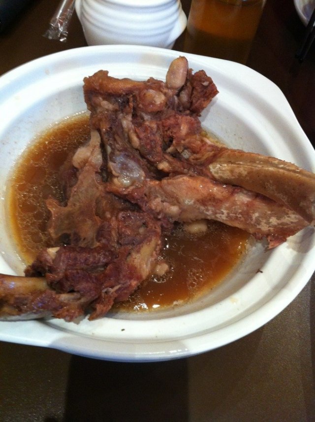 【牛大骨】:这道菜是每桌必点的菜,骨头上的肉还是蛮多的,啃啃骨头还是很有乐趣的,脆骨很有嚼劲,肉质已经炖的酥烂了,骨髓非常的赞,吸吸营养都在骨头里,汤汁非常的鲜美,拌饭就更加的赞了!都是经过很有小时的熬制才会有这么精美的菜!不容易!