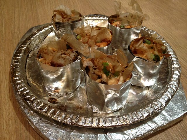 【木鱼花炭烧豆腐】48元,这道菜点的好失败,至少我和老公都不爱吃。作为一道素菜比鮰鱼价格还贵,豆腐是论个装在锡纸筒里,8元一个,6个起点。一个锡纸筒里面有很多小块嫩豆腐,有几个酱浓味道偏咸,又有一个味道略淡,不太稳定云间。上面铺着木鱼花,里面有肉丁和松子,整体的口味是略带甜味的。