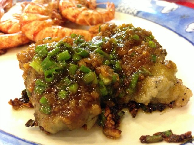 淋上黄油和酱油调配的酱汁 再加上葱蒜 就完成咯