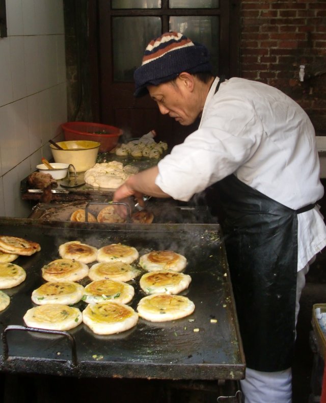 早上有人排队,好在人不多,只六、七个人。听阿大同别人说一天要卖几百人葱油饼。趁排队的功夫,看全了制作的全过程。面团是事先和好的,加了不少油。揪下一个个小面团,摊成长舌状。用手抹上油和葱末、肉末。卷成团,再按平一些。将二十个左右的面团放在炉子最上面的方形盘子,用油煎一会,不断地用手或工具按圧,最后按成饼状。这时,中间的面团因温度较高,一面已煎变色,翻转继续煎。直至两面金黄。步骤并没有完成。还要拉开盘子,在下面的炉膛里再烤上一会,才算大功告成。再把两边的面团放在中间继续同样的步骤。等着煎饼的时候,阿大又不停地捏小面团。