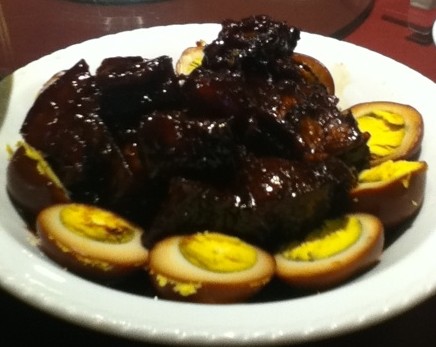 上周末去新南华喝喜酒,一楼的大堂里面,30多桌,是吃本地人的喜酒,所以蹄髈和红烧肉肯定是少不了的。红烧肉蛮好吃的,虽然因为菜色众多,红烧肉并不那么出众,还是吃了一块,蛮好吃的,肉很精很入味,浓油赤酱的,而且并不是那么甜,反倒是后面的一道牛排,同样是浓油赤酱的做法,就很甜。如果你两个一起吃,你会觉得红烧肉是咸的,牛排是甜的。在桌面上我们主要是把海鲜类的吃掉,蹄髈和红烧肉都剩了很多,被精明的主人打包带走,相信没那么多菜,慢慢品尝这个红烧肉,会觉得更加好吃。
