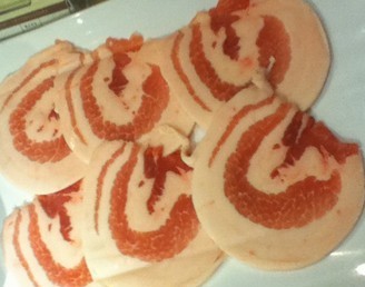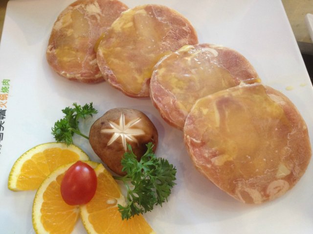 烤极品火鸡(约250克,价值37元),4大块肉,切得还挺厚实,摆放着造型不错,中间一个小香菇被切成了花形,还挺好看的。口感还算不错。