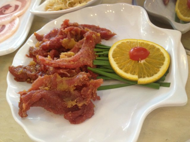 烤猪五花(约250克,价值35元),服务员告诉我们先烤这个五花肉比较好,因为把肉的油烤出来后再烤其它的肉和菜就比较好吃,烤的焦一点,然后蘸着烤肉酱卷着生菜吃,夹些蒜片、辣椒非常好吃~~~