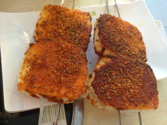 烤鸡翅(2串,价值10元),烤得挺焦的,只是个头小了点。