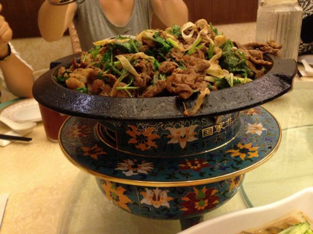 没桌来这吃饭的人必点烤肉,我们点了烤精品羊肉128元,烤精品牛肉98元,上来时都是景泰蓝铜锅盛着,里面点火保温,兹兹冒着热气。上面肉可比涮火锅的牛羊肉瘦多了,配合大葱和香菜炒熟,或许是烤熟吧,反正香菜点缀我喜欢,烤一会再吃没那么多油了更好吃。