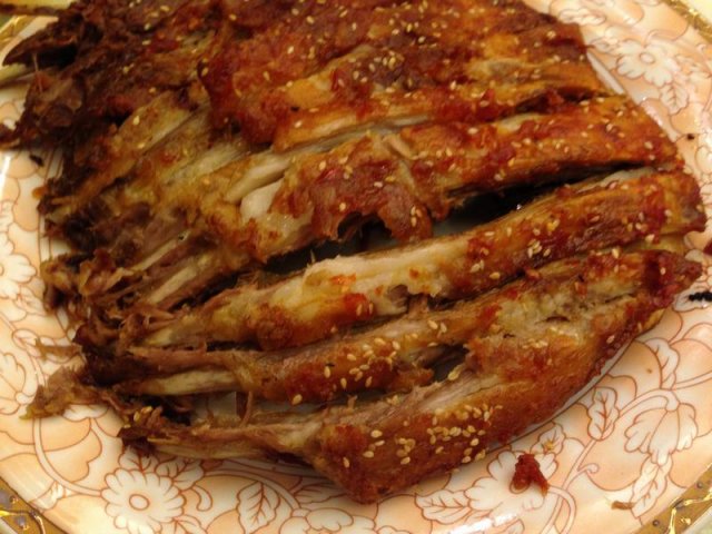还有一道大菜烤羊排158元,端上前服务员会帮忙切分好,搭配辣椒面沾着吃,其实不沾也有腌制的香料味道了,外皮酥香,肉质肥瘦相间,火候恰好实在很赞。