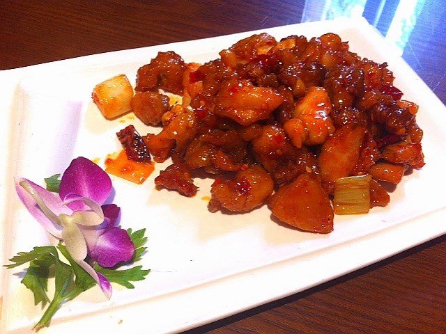 贵妃宫保鸡:甜辣的一道菜,里面还有不少荔枝,第一次吃到这种炒法的宫保鸡,味道挺好。