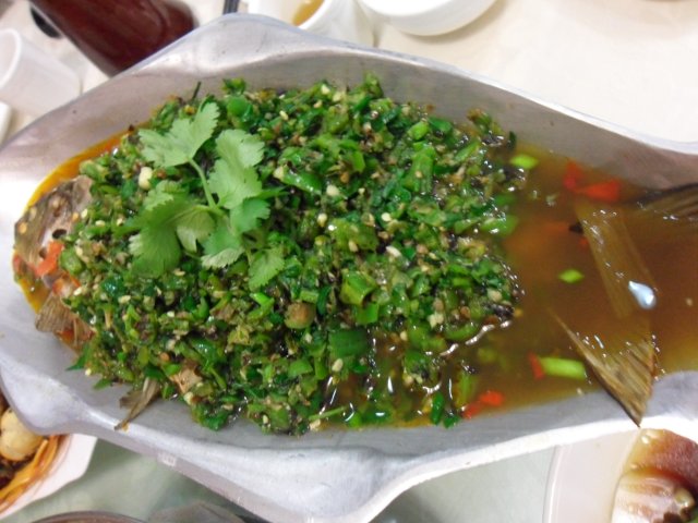 这个鱼算是最后上的了,店家特地做的鱼的模型,很特别..鱼刚上时候是没有怎么进味的,煮了一会儿以后才进味,而且老板娘推荐是要吃一块鱼肉就加上一点鱼身上的香料噢,这样才能品味出这道菜的味道..试了一下,确实是这样,香料的味道很特别,吃起来的味道也确实不一样,值得推荐..